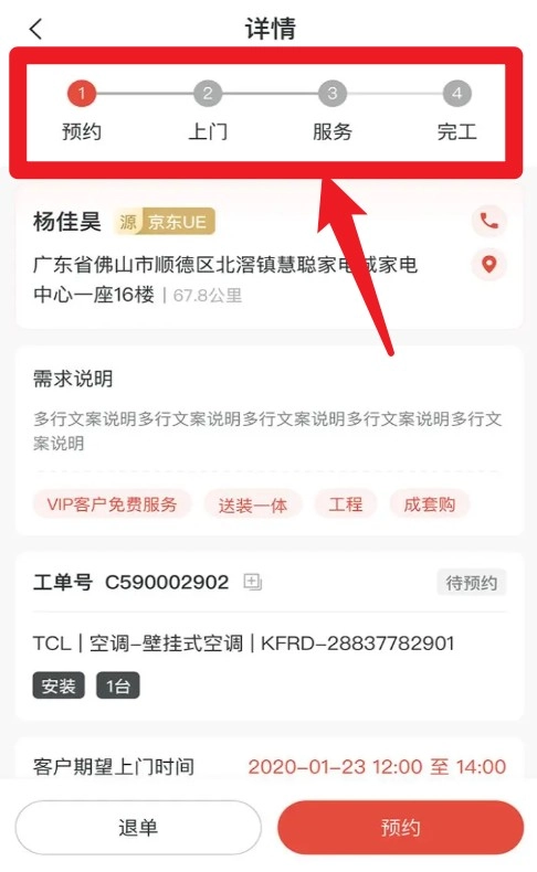 点击任意工单进入详情页面后,能够查看预约、上门、服务、完工等全流程进度,还可以开展预约时间调整、服务确认等相关操作。