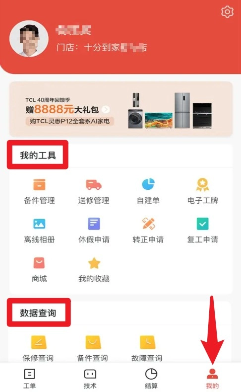 点击底部的“我的”页面,就能进入个人中心,在这里你可以使用“我的工具”里的备件管理、自建单、电子工牌等功能,还能查看维修记录。