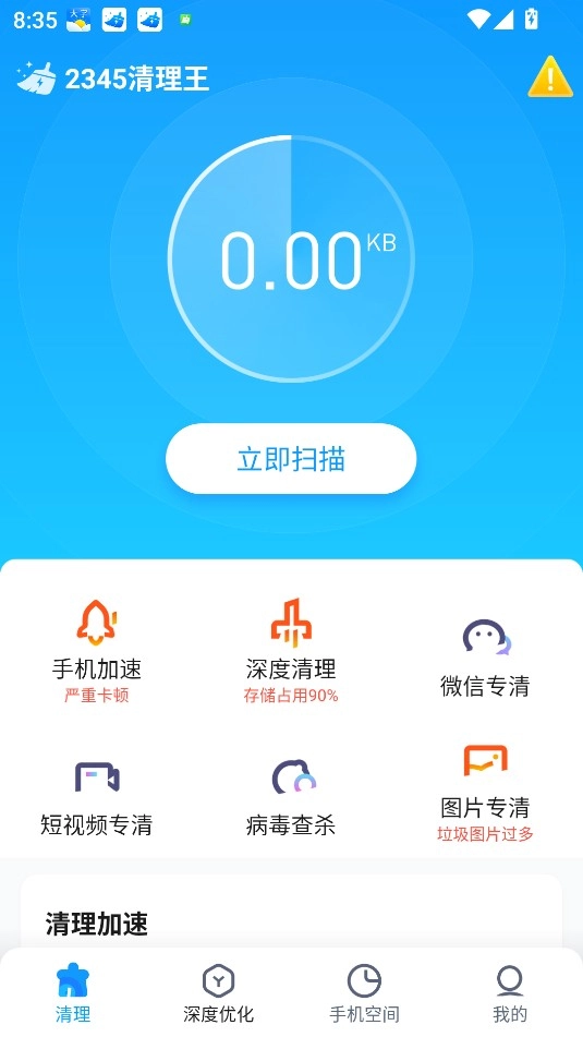 打开,首页可立即为手机扫描清理垃圾。