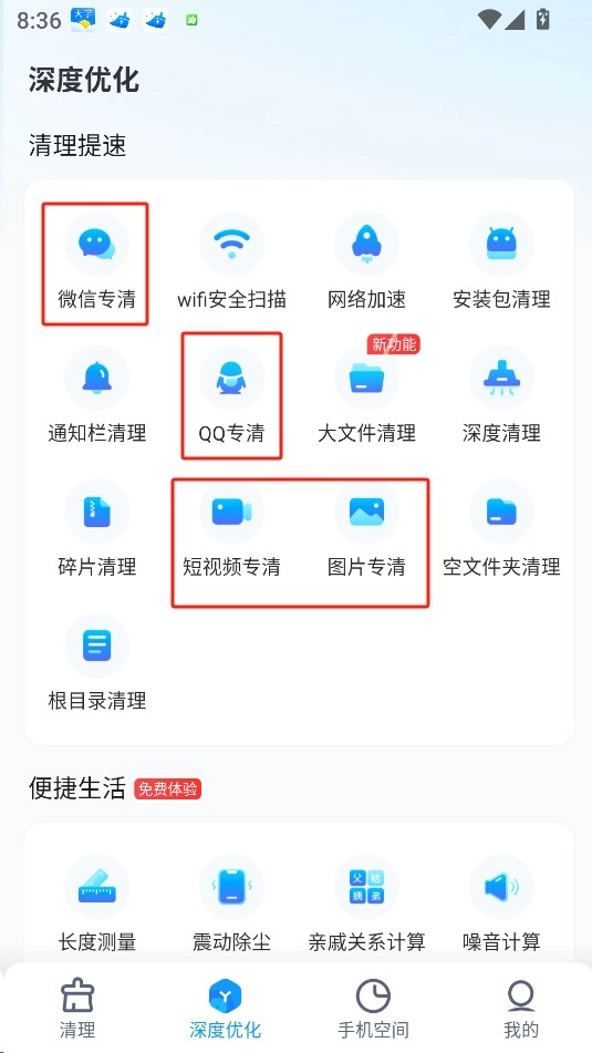 还能对手机进行深度优化,提供微信专清、QQ专清以及短视频清理功能,既精准又高效。