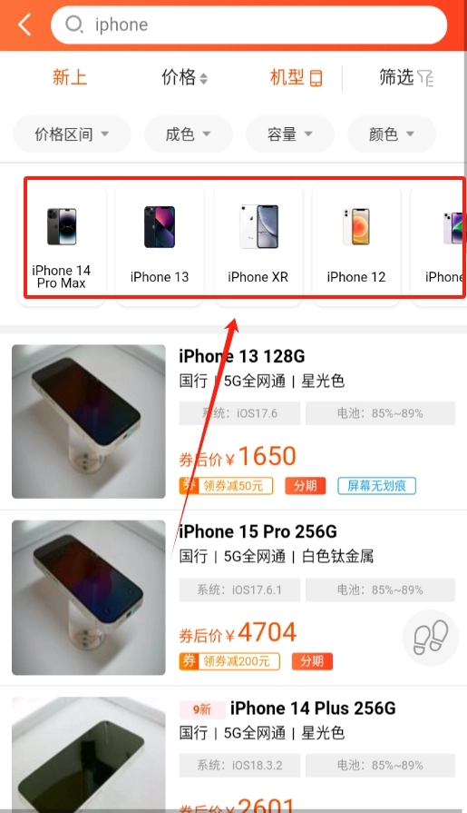 选好品牌后,页面会呈现该品牌的多款手机型号,你可以从中挑选出想要购买的那一款。