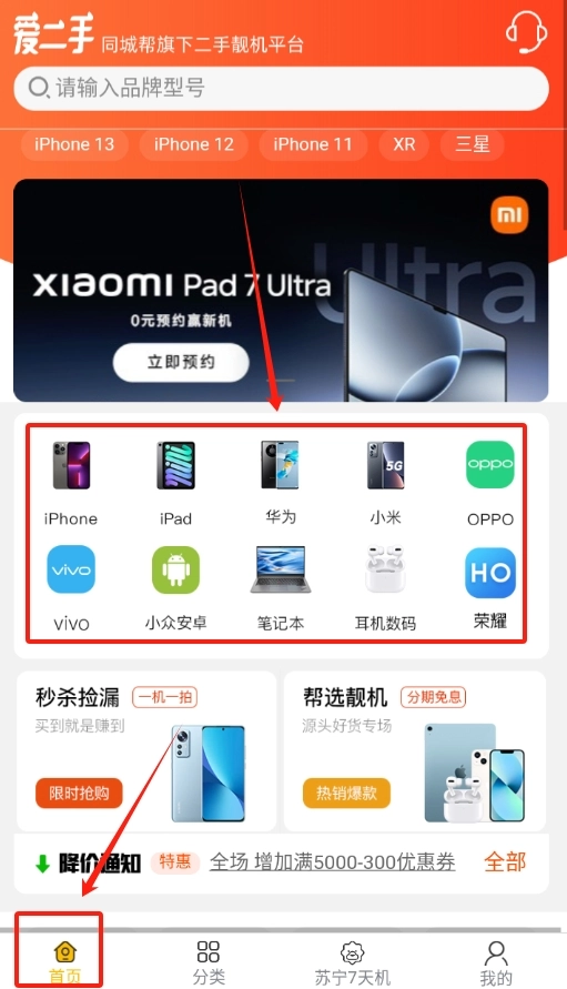 打开同城帮二手优品软件,进入首页后,在众多品牌标识中挑选你心仪的手机品牌。