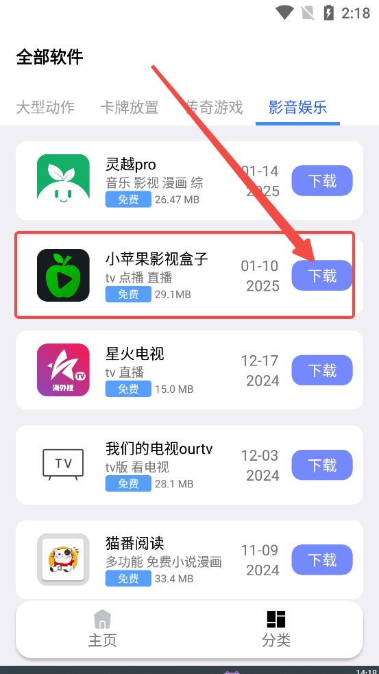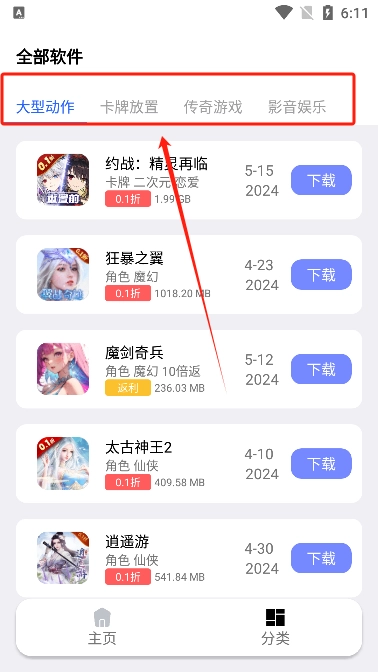 打开进入后,能够点击分类栏,里面设有热门游戏App以及影视软件。