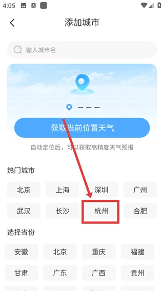 在添加城市的页面里,从热门城市列表中选择【杭州】这一选项,即可完成该城市的添加流程。