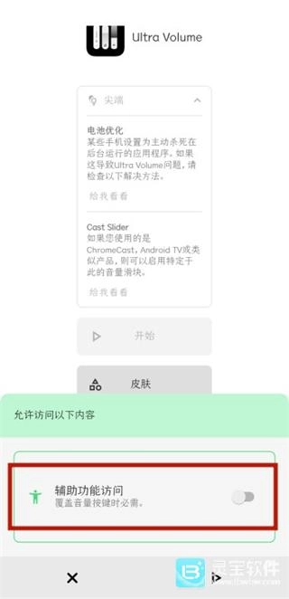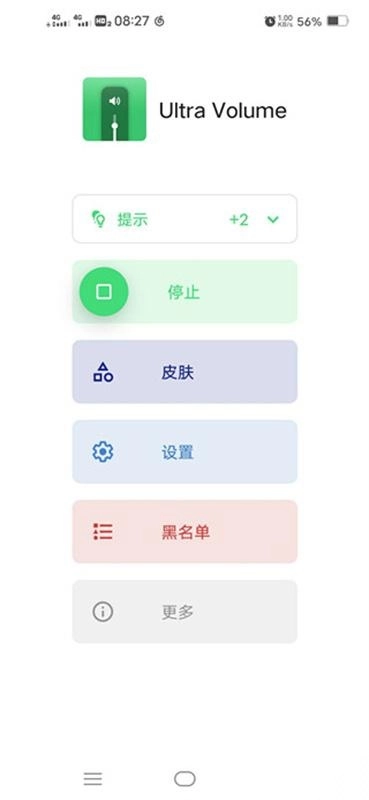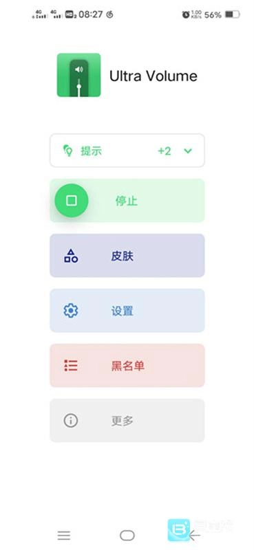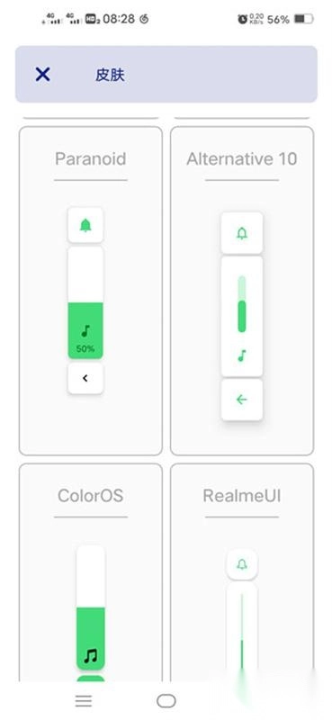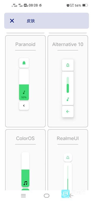 3、要是你想解锁更多姿势,可点击首页的皮肤按钮,更换各类皮肤。这里有14种音量面板皮肤供你选择,涵盖了Android10、MIUI、OneUI、EMUI等常见的不同手机音量样式。