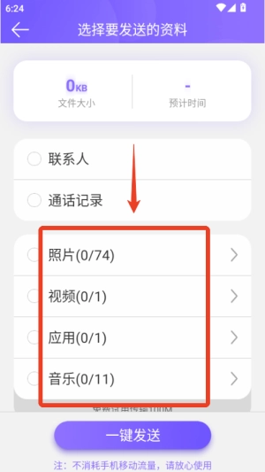 2、支持图片、视频、通讯录、短信、软件等多种类型的数据,可一次性完成迁移。