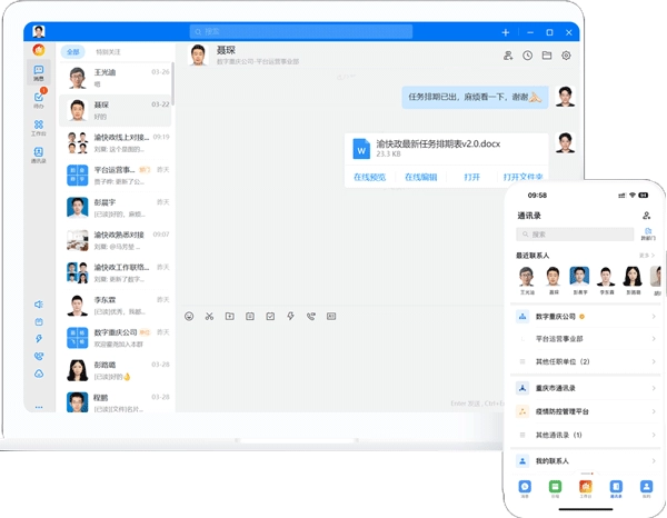 “渝快政”具备全市统一的政务通讯录和即时通讯两大功能。公职人员可在全市范围内,不受地域、层级、部门限制,轻松找到工作对接人,还能通过文字、语音、视频、文件等多种消息形式沟通,消息的未读与已读状态清晰可见。此外,平台提供安全、稳定且智能的线上音视频会议服务,支持移动办公与智能消息推送,让全市市级部门、各区县以及企事业单位实现扁平化连接,沟通便捷高效。