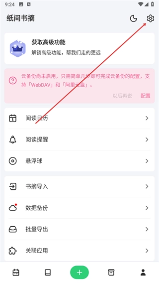 1、打开纸间书摘,找到右上角设置图标,点击进入设置页面。