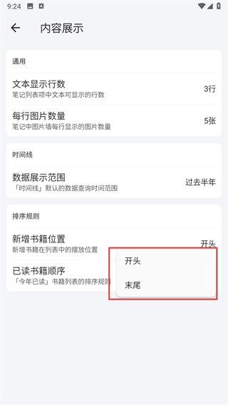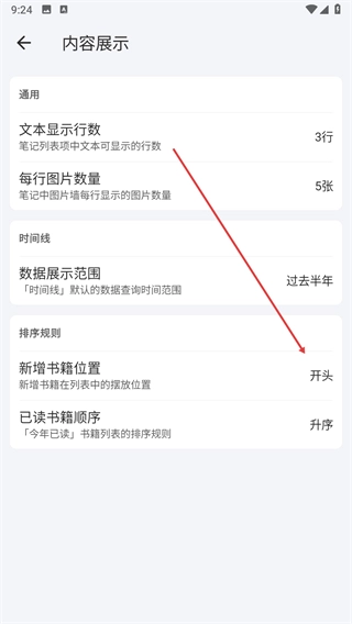 3、进入内容展示界面后,找到排序规则板块里的新增书籍位置选项。