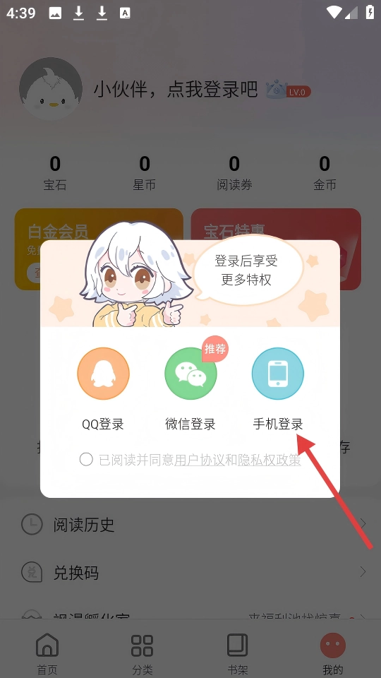 3、点击登录按钮后,可选择【手机登录】方式,勾选相关协议就能完成登录操作。