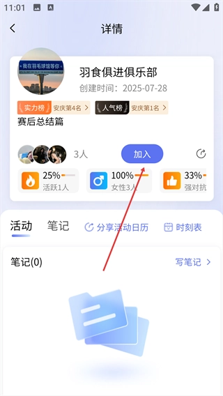 4、在俱乐部详情页面,点击【加入】按钮,完成俱乐部的加入操作。