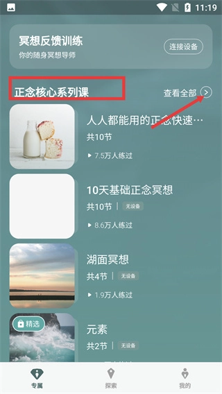 1、进入冥想反馈训练界面,找到【正念核心系列课】板块,点击其右侧的【查看全部】,可浏览该系列的完整课程列表。