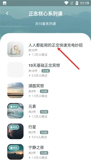 2、进入正念核心系列课列表,选择【人人都能用的正念快速充电妙招】课程,该课共10节且7.5万人练过,点击可进入详情。