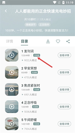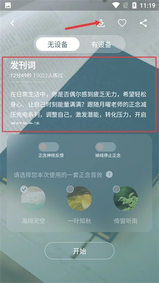 4、进入【发刊词】学习界面,先选【无设备】模式,再选定正念音效,确认设置后点击【】按钮开启课程操作。