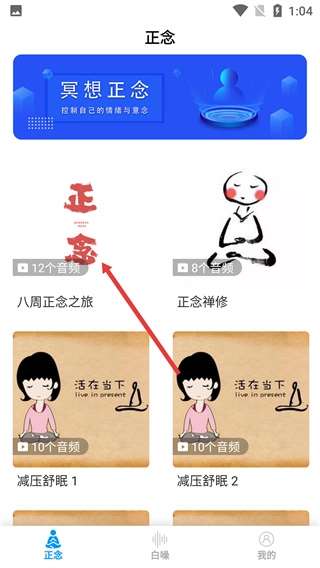2、进入正念页面,可以看到有需要的音频课程,点击课程条目可进入对应的课程详情列表页。