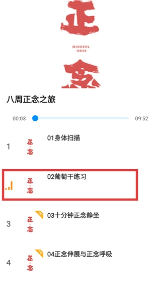 3、进入【八周正念之旅】课程页,选择【02葡萄干练习】课程条目,点击即可开始学习该节正念音频内容。