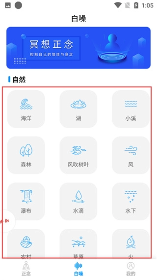 4、进入白噪页面,在【自然】分类下选择【海洋】、【湖】等音效选项,点击对应音效即可启用该白噪音辅助冥想。