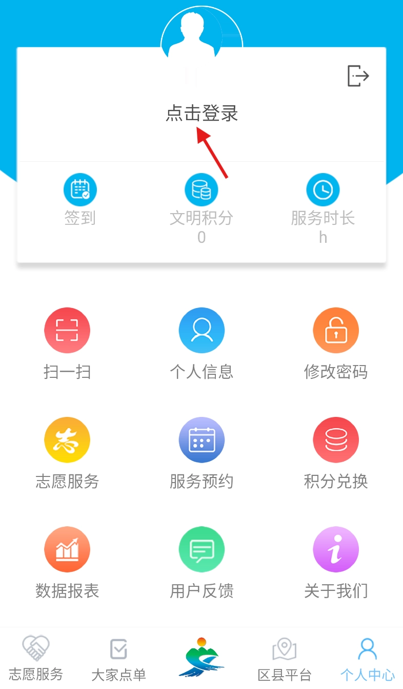 进入个人中心后,在页面上方找到 “点击登录” 按钮,点击该按钮跳转至登录相关界面。