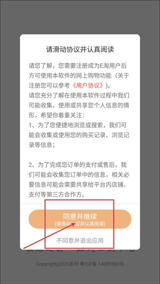 进入应用后,需要滑动阅读协议内容,在了解个人信息收集规则后,点击【同意并继续】按钮,才能使用【E淘】的购物功能。