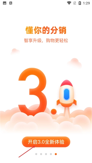 在版本介绍页面,点击【开启3.0全新体验】按钮,即可进入应用的后续流程。此版本主打优化分销功能,提升购物体验。