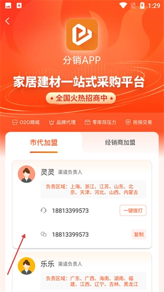 进入分销平台界面后,能查看【市代加盟】【经销商加盟】的相关信息,获取对应区域渠道负责人的联系方式,还可联系注册。