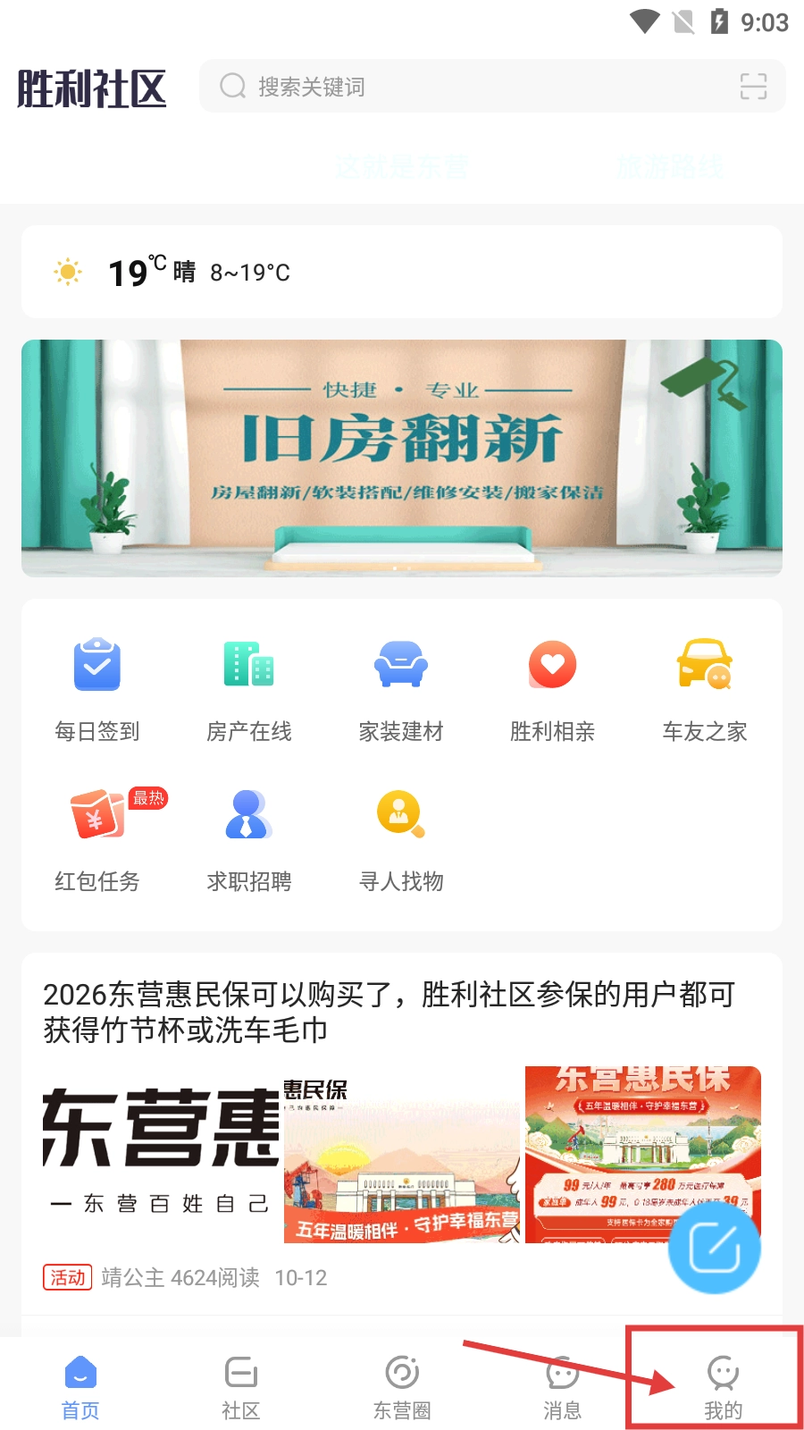 进入【胜利社区】首页后,点击右下角的【我的】按钮,就能进入个人中心页面了。