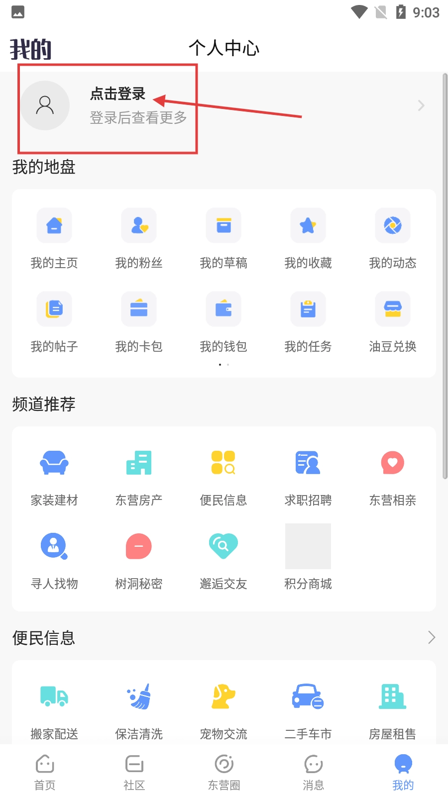 在个人中心页面,找到【点击登录】的区域并点击,即可进入登录界面。