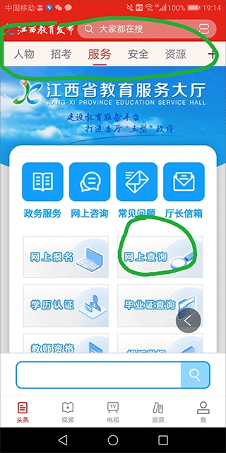打开应用后进入头条页面,接着向左滑动屏幕上方的选项栏,滑到“服务”选项的位置,然后点击其中的“网上查询”功能。