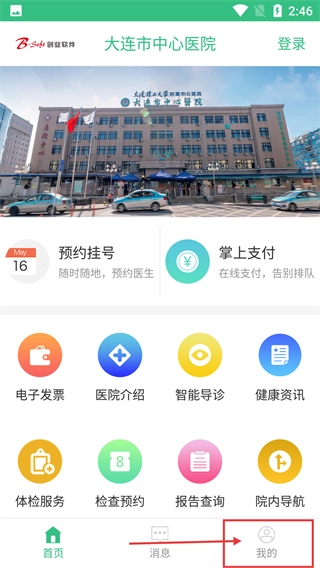 在【大连市中心医院】软件的首页,点击右下角的【我的】选项,就能进入个人中心页面。