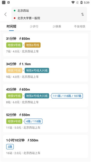 然后可以通过选择耗时短、步行少、换乘少、不乘坐地铁等条件来规划出行路线;