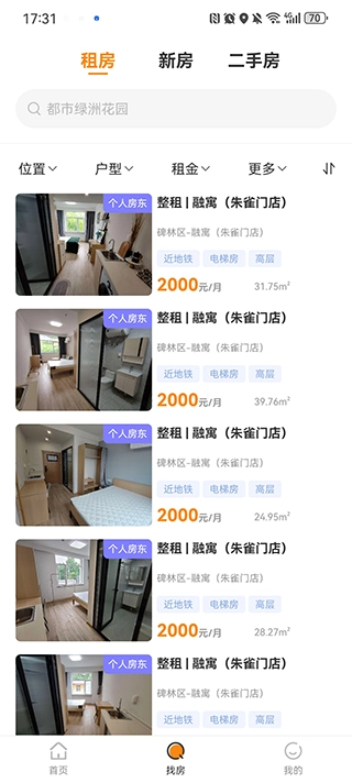 用户登录后即可进入首页,在首页能查看在租房源、精品新房、二手房源等各类房源信息。