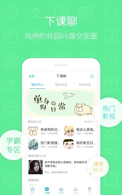自从下课聊上线了“操场”社区,连原本无聊的课间都变得让人停不下来!每天都忙着去“我这么美”板块看萌妹的自拍、去“随手拍”里调侃逗比室友、去“1001”栏目找乐子~最近总捧着手机嘿嘿傻笑,哥们儿都怀疑我交了女朋友,我意味深长地冲他们一笑,说:“女票正在操场等我呢!”
