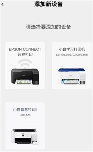 2、点击【暂无设备,前往绑定】选项,接着挑选需要添加的设备,当前仅兼容EPSON、小白学习打印机以及小白智慧打印II这几款设备。