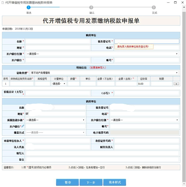 进入方式:依次选择【办税中心】—【发票使用】—【发票代开】,然后点击“代开增值税专用发票”选项进入对应界面。