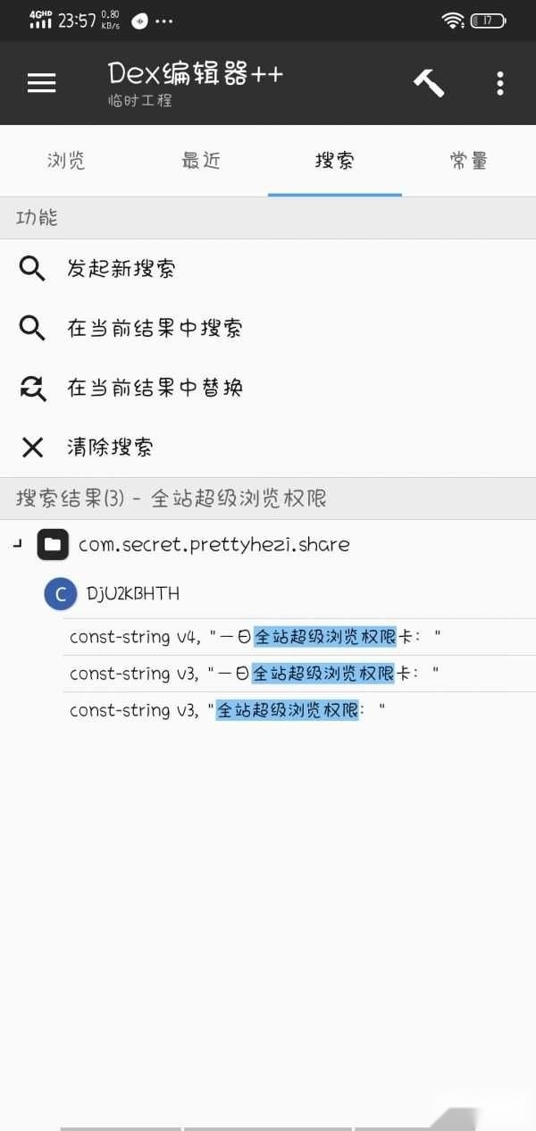 2、使用dex++工具全选所有dex文件,然后搜索包含“全站超级浏览权限”的代码内容