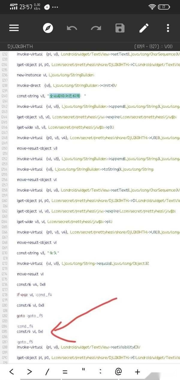 3、点击搜索结果里的*下面这个内容,向下滚动到1285行,将const/4v1.0x0修改为const/4v1.0x1