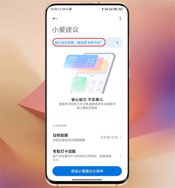 在桌面长按小爱建议的部件,选择“编辑”进入功能编辑页面,接着点击顶部的“权限提醒”选项,再点击去设置,最后开启相应的权限即可。