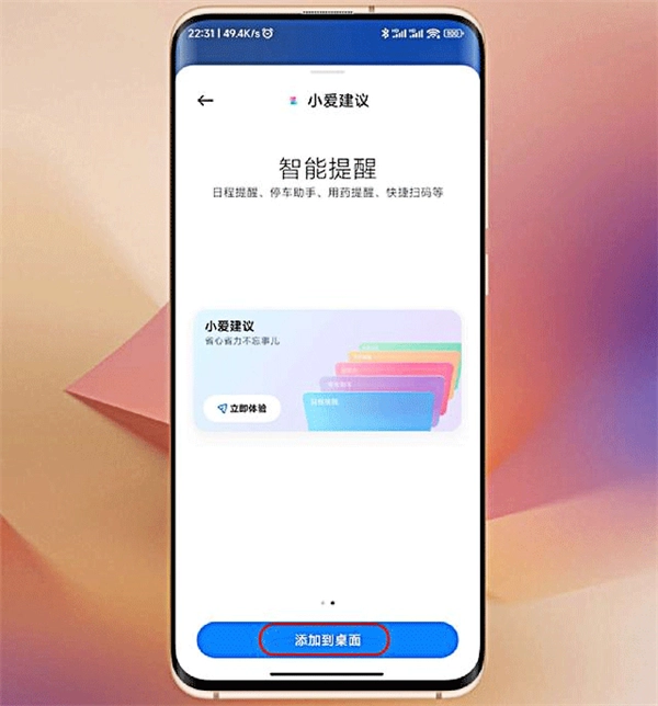 在本站下载并安装完成后,进入屏幕的桌面编辑模式,点击桌面底部的“添加小部件”选项。进入小部件市场后,点击右上角的“搜索”按钮,输入“小爱建议”进行搜索,找到后点击将小爱建议添加到桌面即可。