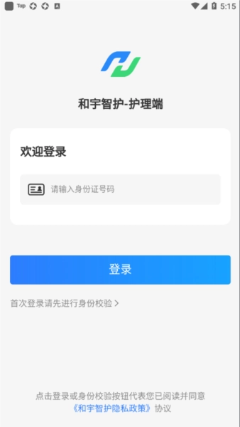 首次登录需进行真实身份验证:打开医护端与宇智护应用,进入登录界面后,点击【初次登录请先进行真实身份验证】选项,即可进入身份证识别页面。