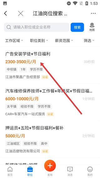 在【江油岗位搜索】页面,浏览岗位列表,挑选感兴趣的职位,例如【广告安装学徒+节日福利】。