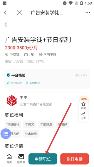 进入职位详情页面后,点击【申请职位】按钮即可申请该招聘岗位。
