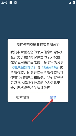 开启交通建设实名制功能,待弹出协议窗口后,点击【同意】按钮,以此确认同意《用户服务协议》和《隐私政策》。