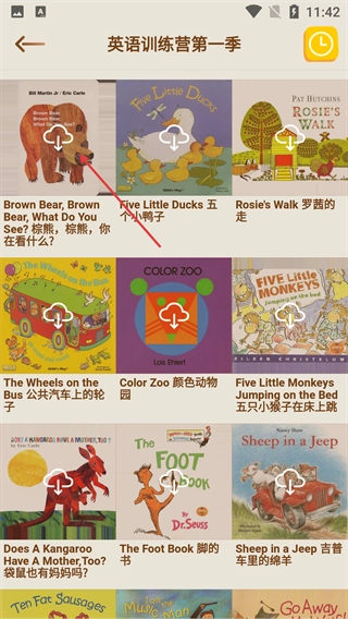 进入【英语训练营第一季】页面后,点击绘本上方的图标,就能获取对应的绘本资源,便于离线查看学习。