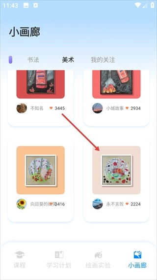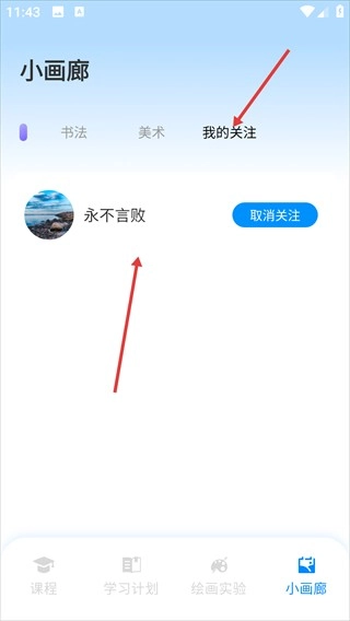 4、回到小画廊页面,切换到“我的关注”标签页,就能看到刚刚关注的作者了。