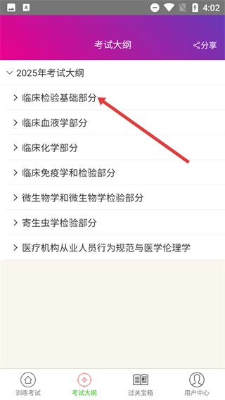 进入【考试大纲】界面后,能查看【2025年考试大纲】里包含的【临床检验基础部分】【临床血液学部分】等章节内容,大家可以挑选对应的章节开启学习。