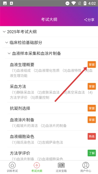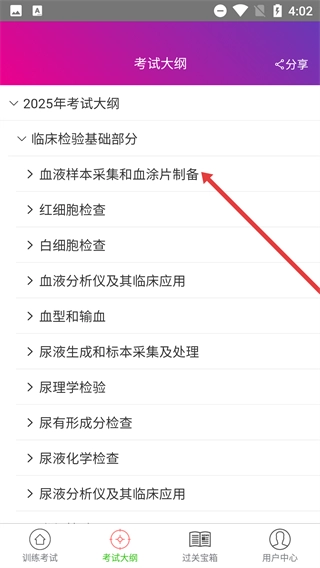 点击【临床检验基础部分】,展开后能看到【血液样本采集和血涂片制备】【红细胞检查】等细分知识点,从而深入掌握章节内容。