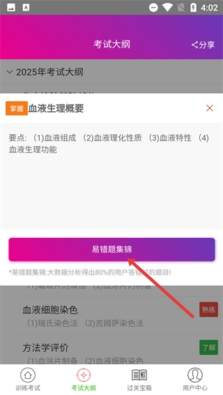 点击像【血液生理概要】这类具体知识点,就能查看它的要点内容,另外还可以点击【易错题集锦】,通过练习由大数据分析筛选出的易错题,来加强对知识点的掌握程度。