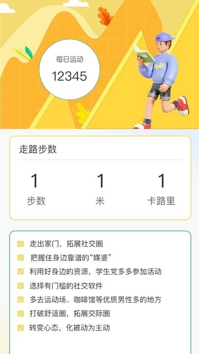 【每日步数查看】可自动为用户记录步数、行走距离及消耗的卡路里,还会通过贴心小卡片提醒用户培养健康的生活习惯。