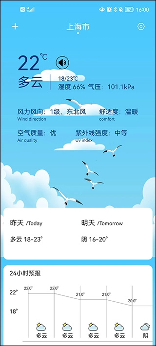 便于查看24小时内的天气变动情况,避免早晚温差过大带来的影响,还会更新未来一周内每小时的空气质量、空气污染状况、PM2.5指数以及空气质量指数。