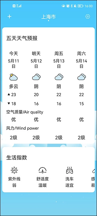 用户除了能查看基础的每日天气外,还可以了解未来五天的天气预报,以及生活指数里的紫外线、舒适度等信息。